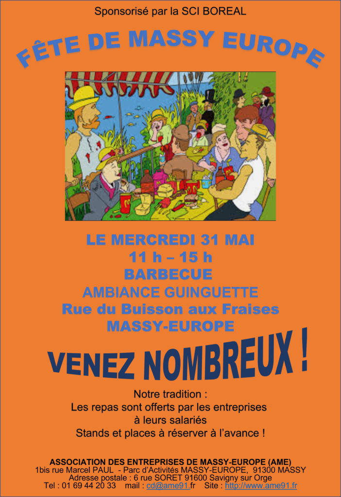 Comme cela est devenu une tradition à Massy-Europe, notre grande fête annuelle sera organisée le Mercredi 31 MAI de 11 h à 15 h rue du Buisson aux fraises.